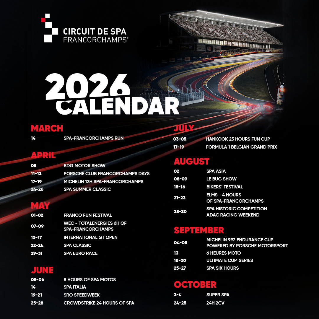Het team van Circuit Spa-Francorchamps kijkt ernaar uit om dit nieuwe seizoen met u te delen, samen spannende momenten te beleven en nieuwe, onvergetelijke herinneringen te creëren. 2026 belooft een uitzonderlijk jaar te worden, met toekomstige projecten, evenementen speciaal voor autosportliefhebbers, en nog veel meer.