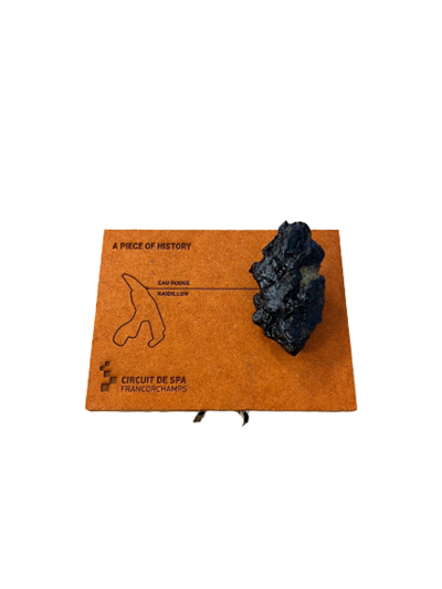 Réalisée par la société malmédienne qui a également conçu le trophée du Grand Prix de Belgique de F1, cet objet de décoration contient un fragment de tarmac qui recouvrait le Raidillon de l’Eau Rouge avant son resurfaçage au printemps dernier, posé sur un socle aux couleurs ocres. Un virage mythique et historique, dont l’asphalte qui compose cet objet de décoration inédit et exclusif, a vu s'affronter les plus grands pilotes de la F1 depuis les années 90.