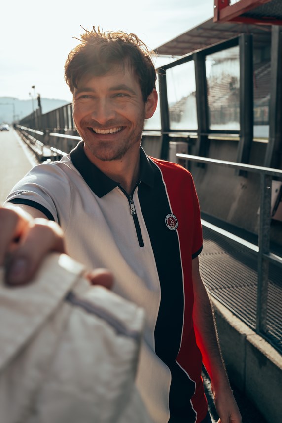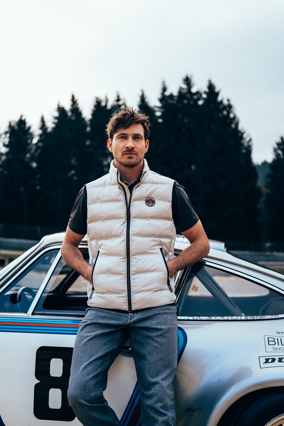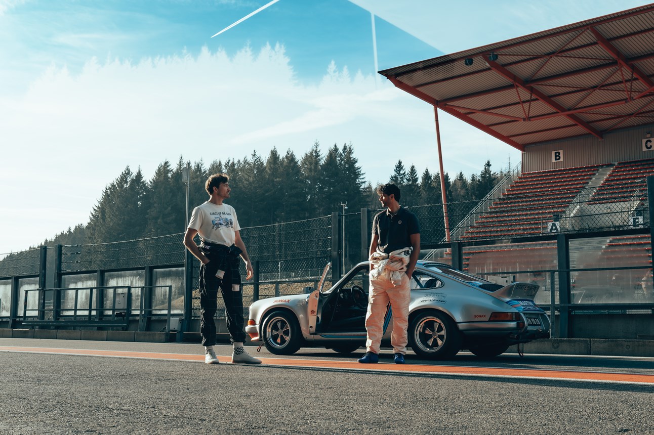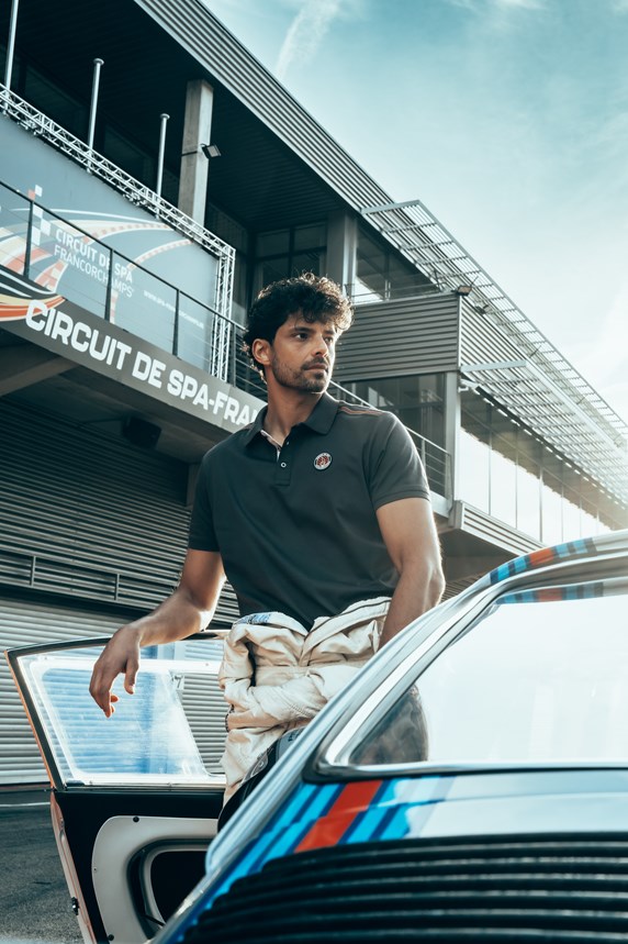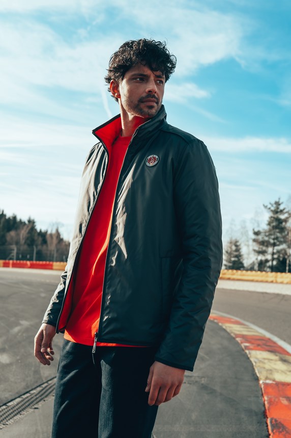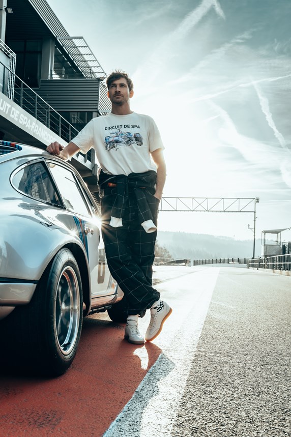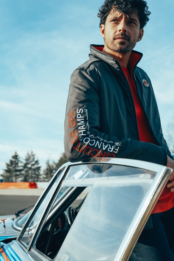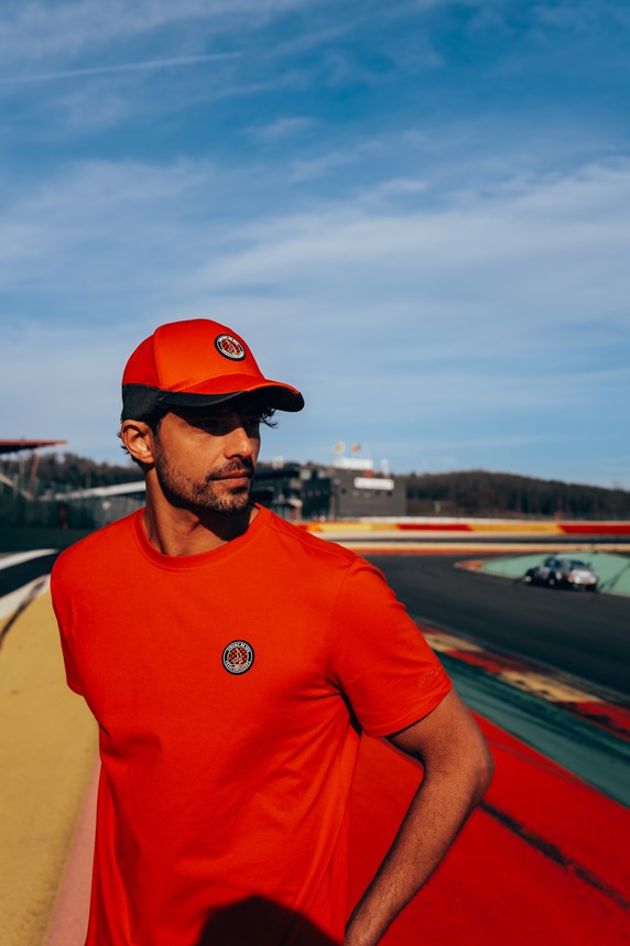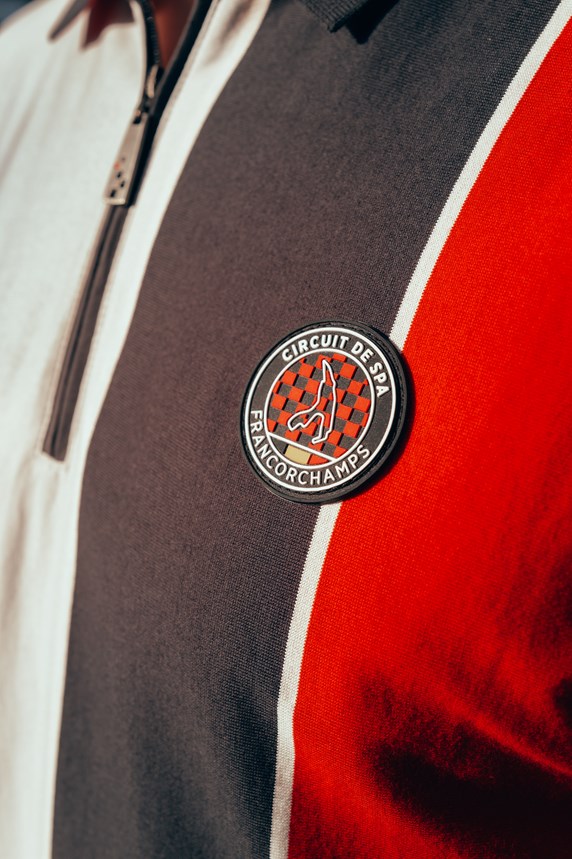 passionnés de sport automobile. Afin de donner vie à la collection sur le lieu qui l’a inspirée, un shooting photo exclusif a été réalisé sur le circuit, avec ses virages iconiques et les paysages ardennais en toile de fond.