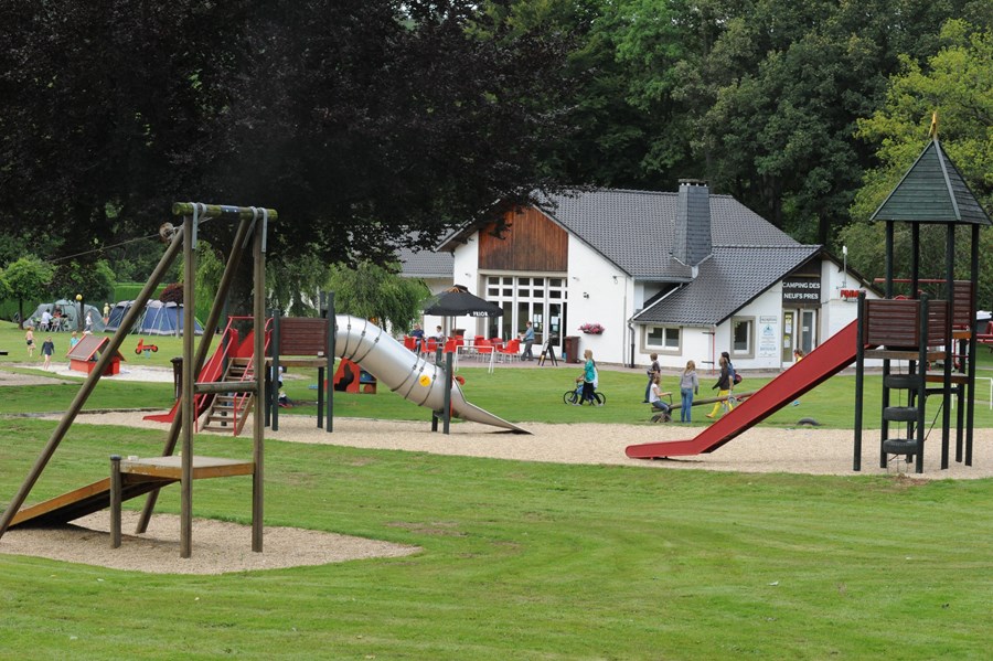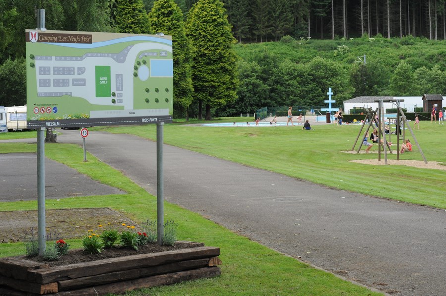 In een bosrijke omgeving langs de Salm, drie-sterren camping met plaatsen voor tenten, caravans, campers.