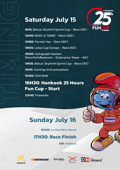 De Hankook 25 Hours Fun Cup is echter vooral een feest voor het hele gezin, want naast de actie op de baan wordt u ondergedompeld in een vermakelijke sfeer met talloze activiteiten, die iedereen een onvergetelijke ervaring zullen bezorgen. Zet de snelste tijd neer op de simulator, waag uw kans in het skatepark van McDonald’s of spring erop los op de verschillende springkastelen in de kleuren van de Smurfen. Als kers op de taart is er het vuurwerk aan de voet van de Raidillon omstreeks 22.45 uur.