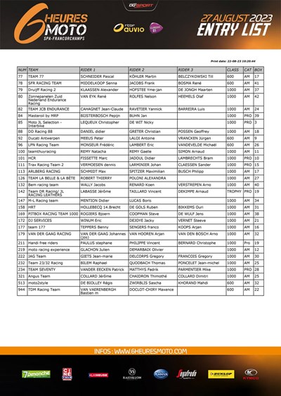 De 6 Heures Moto is modern endurance. Vertaling: het tempo ligt nooit lager en van de eerste tot de laatste minuut van de race zijn de tijden adembenemend. Van de zoektocht naar de laatste tienden op het circuit tot de inzet van de beste strategie in de pits, dit evenement van DG Sport vergroot de inspanningen op lange termijn en brengt alle ingrediënten samen voor een spannend spektakel! Hoewel de 6 Heures Moto openstaat voor alle teams, zelfs de meest amateuristische in de edele zin van het woord, doet DG Sport zijn uiterste best om zoveel mogelijk mensen van het spektakel te laten genieten. Dit wordt weerspiegeld in de 'vriendelijke' toegangsprijs van €20 vooraf en €25 ter plaatse, en gratis toegang voor kinderen onder 12!