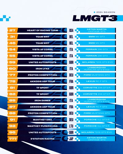- All-new LMGT3 class – replacing the former GTE Am category - will see a total of 18 entries in its inaugural year